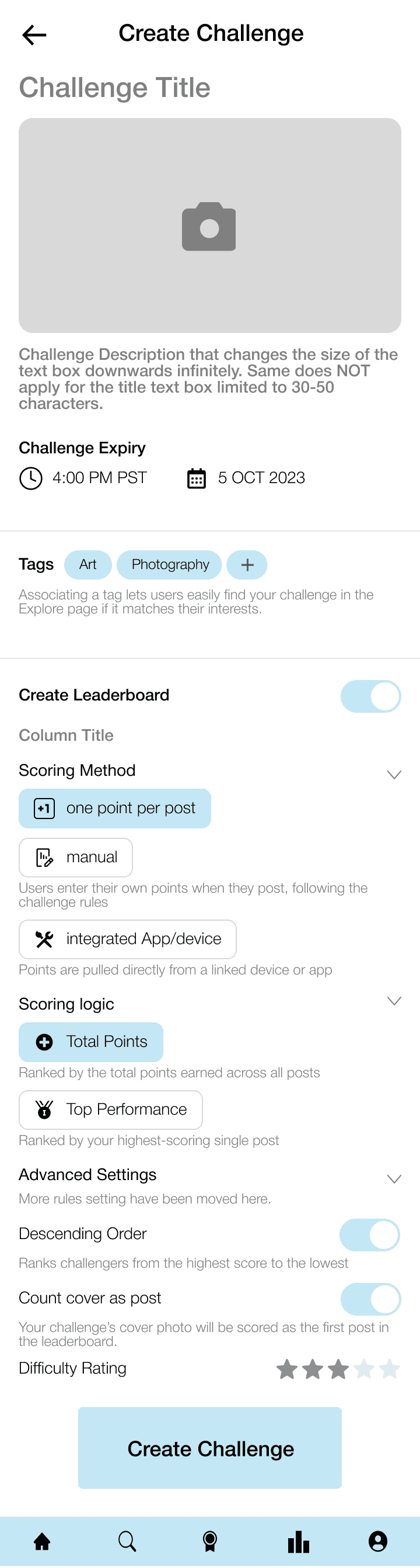 A restructured flow divided into Challenge Basics, Tagging, and Leaderboard Setup